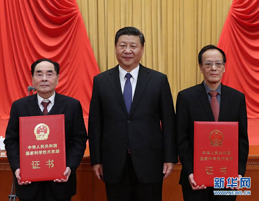 1月8日,国家科学技术奖励大会在北京人民大会堂隆重举行。中共中央总书记、国家主席、中央军委主席习近平向获得2017年度国家最高科学技术奖的南京理工大学王泽山院士(右)和中国疾病预防控制中心病毒病预防控制所侯云德院士(左)颁发奖励证书。新华社记者 鞠鹏 摄
